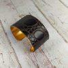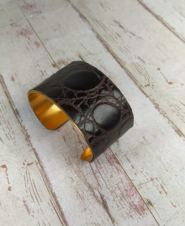 Cette manchette est d’une grande sobriété. Elle habillera votre poignet avec élégance en toute circonstance. Une splendide lanière de cuir marron foncé travaillée façon croco et montée sur un support en laiton brut.