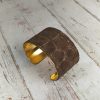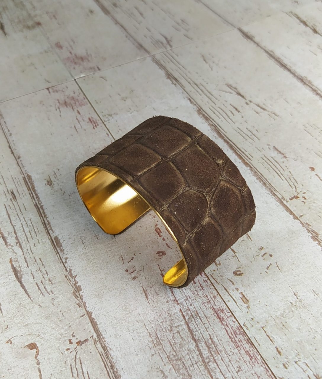 Cette manchette est d’une grande sobriété. Elle habillera votre poignet avec élégance en toute circonstance. Une splendide lanière de cuir nubuck légèrement irisée, travaillée façon croco montée sur un support en laiton brut.