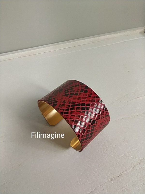 Cette manchette est d’une grande sobriété. Elle habillera votre poignet avec élégance en toute circonstance. Une splendide lanière de cuir travaillée façon serpent montée sur un support en laiton brut.