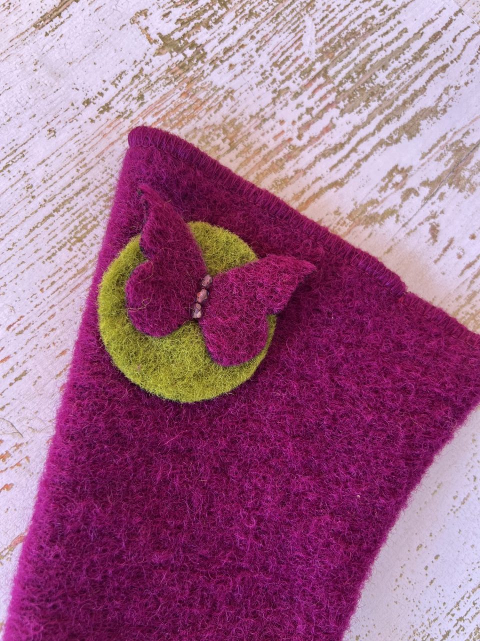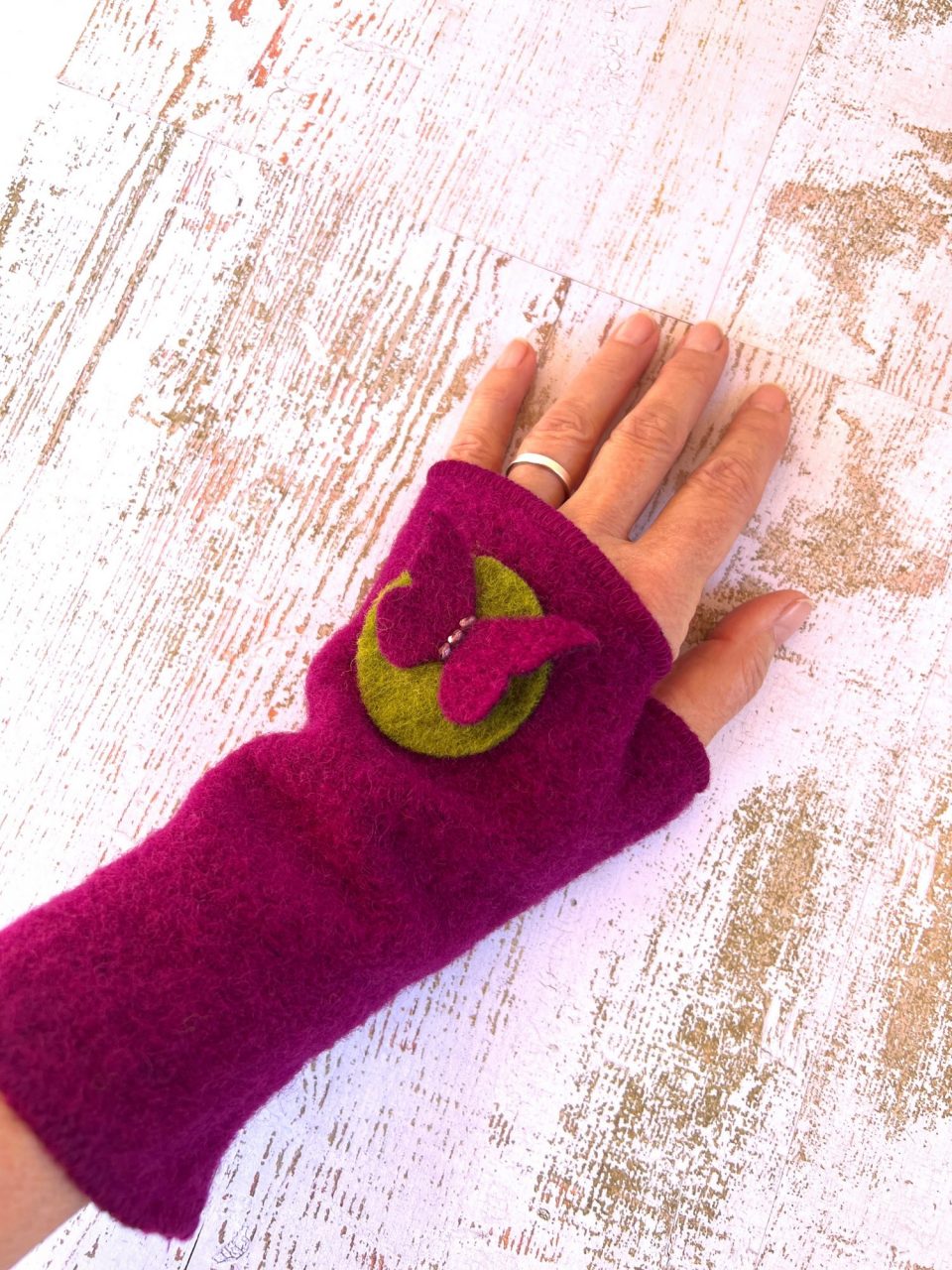 Mitaines laine violette papillon en laine bouillie pour réchauffer vos mains. Vous pourrez vous servir de vos mains sans avoir à quitter vos gants.