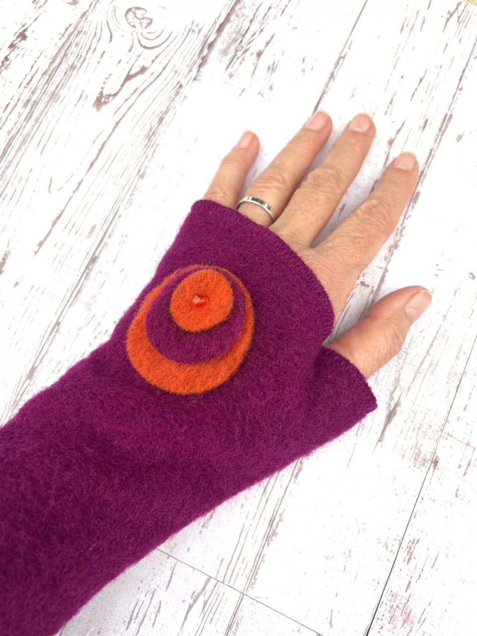 Mitaines laine violette trio de cercles en laine bouillie pour réchauffer vos mains. Vous pourrez vous servir de vos mains sans avoir à quitter vos gants.