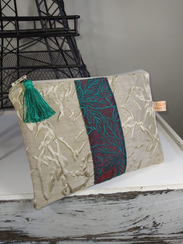 Superbe pochette en tissu beige hyper original nervuré. Elle est agrémentée un somptueux galon en soie au motif vert turquoise, idéale pour une soirée, vous y rangerez votre petit nécessaire, maquillage, portable, clés… Elle sera aussi idéale au fond de votre sac cabas pour les retrouver plus facilement. Un pompon sur la fermeture éclair permet de l’ouvrir facilement.