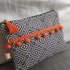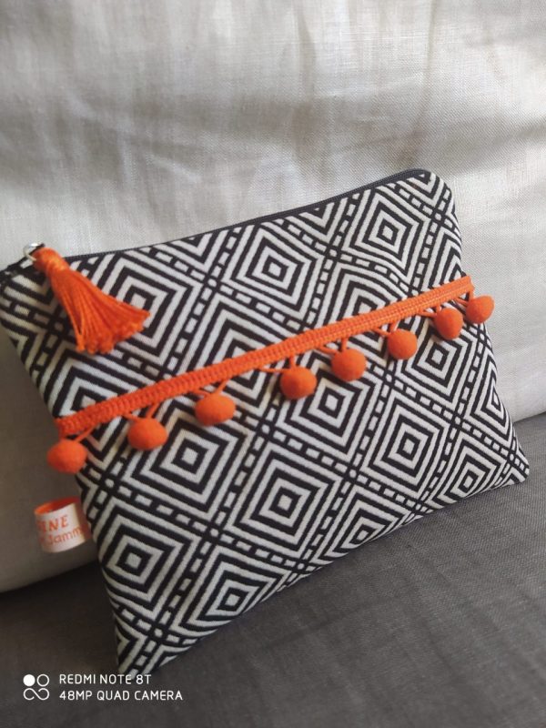 Superbe pochette en tissu haut de gamme géométrique agrémentée d’un joli galon à pompons orange, idéale pour une soirée, vous y rangerez votre petit nécessaire, maquillage, portable, clés… Elle sera aussi idéale au fond de votre sac cabas pour les retrouver plus facilement. Un pompon sur la fermeture éclair permet de l’ouvrir facilement.