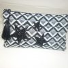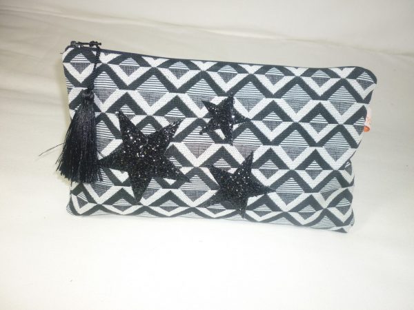 Pochette graphique étoiles et pompon. Imprimé noir et blanc cassé très tendance. Pompon en passementerie et étoiles en paillettes.