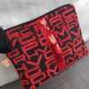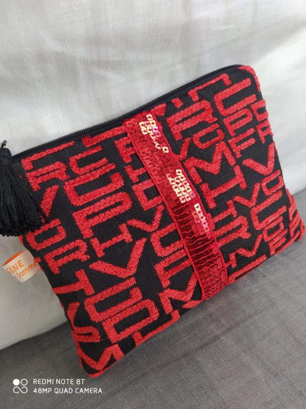 Pochette lettres rouges galon sequins. Cette pochette est en tissu d’ameublement jacquard haut de gamme noir avec des lettres rouges. Le centre est agrémenté d’un joli galon à paillettes rouges. Pochette entièrement doublée avec une toile bachette rouge. Un petit pompon en coton perlé noir termine la fermeture éclair.