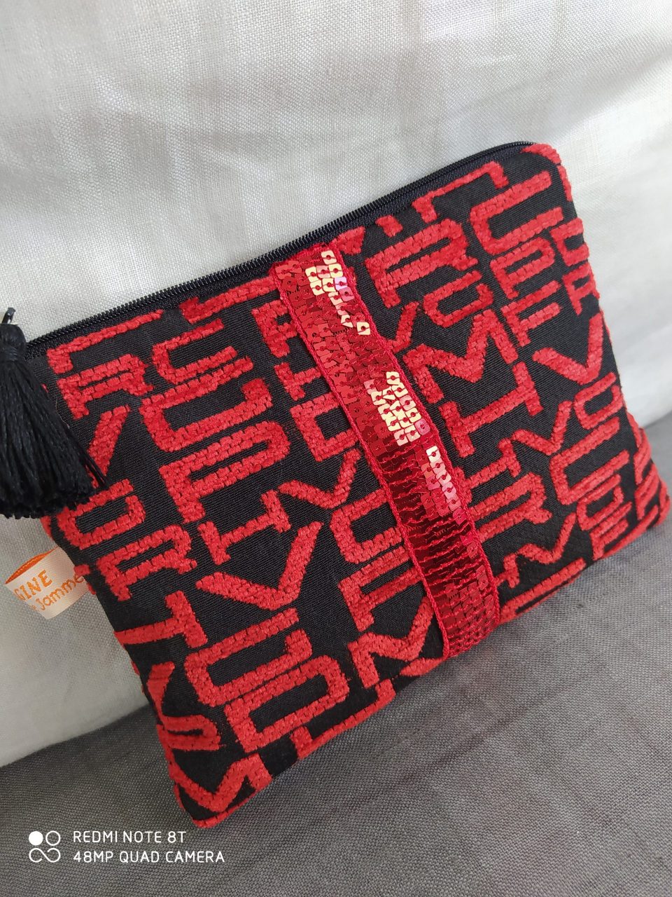 Pochette lettres rouges galon sequins. Cette pochette est en tissu d’ameublement jacquard haut de gamme noir avec des lettres rouges. Le centre est agrémenté d’un joli galon à paillettes rouges. Pochette entièrement doublée avec une toile bachette rouge. Un petit pompon en coton perlé noir termine la fermeture éclair.
