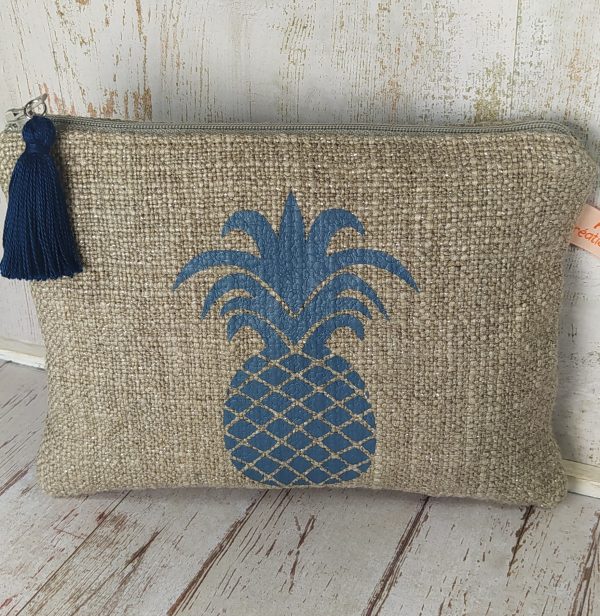 Pochette lin ficelle ananas bleu . Cette pochette est en tissu d’ameublement haut de gamme en lin ficelle irisé argenté. Pochette entièrement doublée de lin enduit blanc cassé. Un petit pompon en coton perlé termine la fermeture éclair.