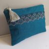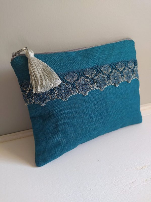 Superbe pochette en tissu lin haut de gamme turquoise agrémentée d’une somptueuse dentelle bleu turquoise et gris légèrement irisée, idéale pour une soirée, vous y rangerez votre petit nécessaire, maquillage, portable, clés… La doublure est en lin enduit turquoise. Elle sera aussi idéale au fond de votre sac cabas pour les retrouver plus facilement. Un pompon sur la fermeture éclair permet de l’ouvrir facilement.