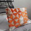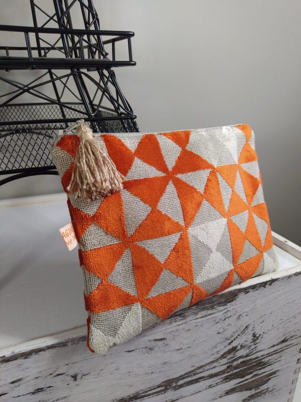 Pochette velours triangles orange. Cette pochette est en tissu d’ameublement velours jacquard haut de gamme, motifs triangles orange et beige très original. Pochette entièrement doublée avec une toile de coton taupe. Un petit pompon en coton perlé beige termine la fermeture éclair.