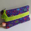 La pochette se ferme avec une fermeture éclair . Un pompon en coton perlé vert permet de tirer la fermeture éclair plus aisément.