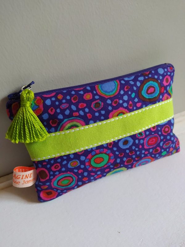 Pochette violette galon vert. Cette mini pochette est en tissu 100 % coton de chez Kaffe Fassett. Le haut de la pochette est agrémenté d’un joli galon vert légèrement fluo. Pochette entièrement doublée avec un lin enduit couleur taupe.. Un petit pompon en coton perlé vert termine la fermeture éclair.
