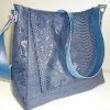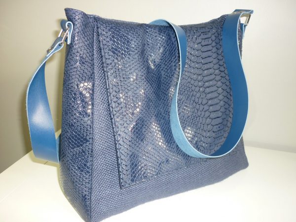 Sac bandoulière bleu marine lézard, taillé dans un magnifique simili bleu marine texture lézard et dans une toile de jute également bleu marine.