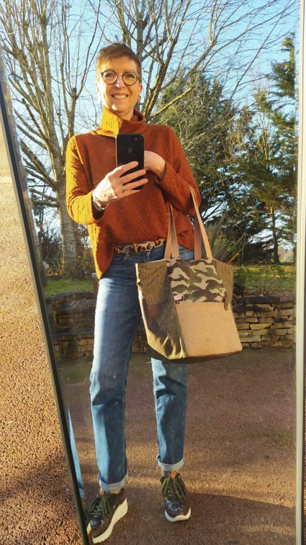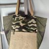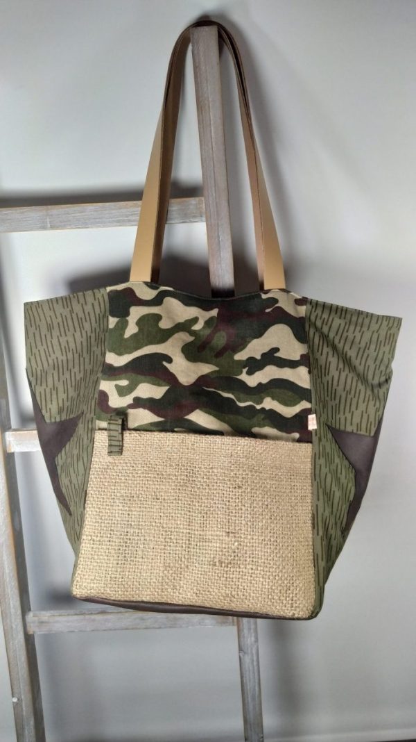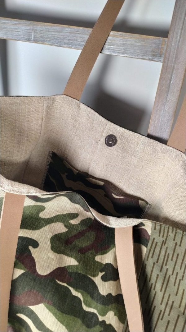 Sac cabas armée jute avec anses en cuir et étoiles en simili. Fermeture par un aimant (déconseillé aux personnes portant un peace maker )