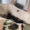Tissu recyclé armée camouflage sur les faces devant et dos, tissu recyclé armée motif « pluie » de 1950 sur les côtés, avec une grande étoile en simili pour la modernité, cousue sur chaque côté.