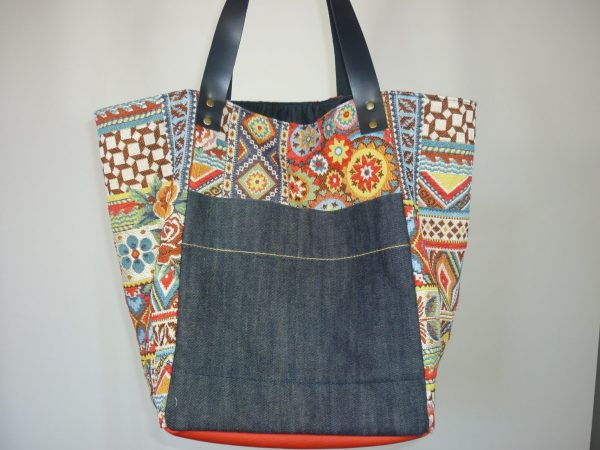 Multicolore et « jean » bleu pour le sac et bleu marine pour les anses. Le fond extérieur et intérieur du sac est en simili rouge.