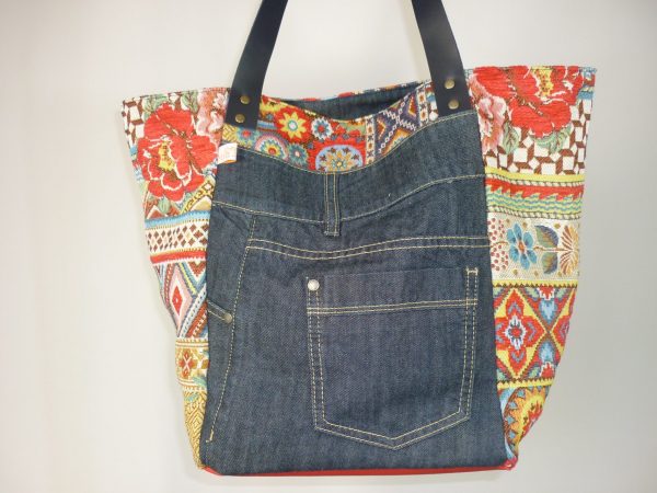 Sac cabas de belle dimension, création unique, parfait pour se sentir à la fois tendance et originale. Il est en « jean recyclé » et en superbe tissu d’ameublement « esprit tapisserie » aux couleurs chatoyantes.  Les anses sont en cuir bleu marine de qualité supérieure et rivetées. Le devant et le dos du sac en « jean »bénéficient de plusieurs poches d’origine. Le cabas est entièrement doublé en « jean » avec poche intérieure et fond en simili rouge vif.