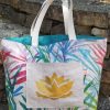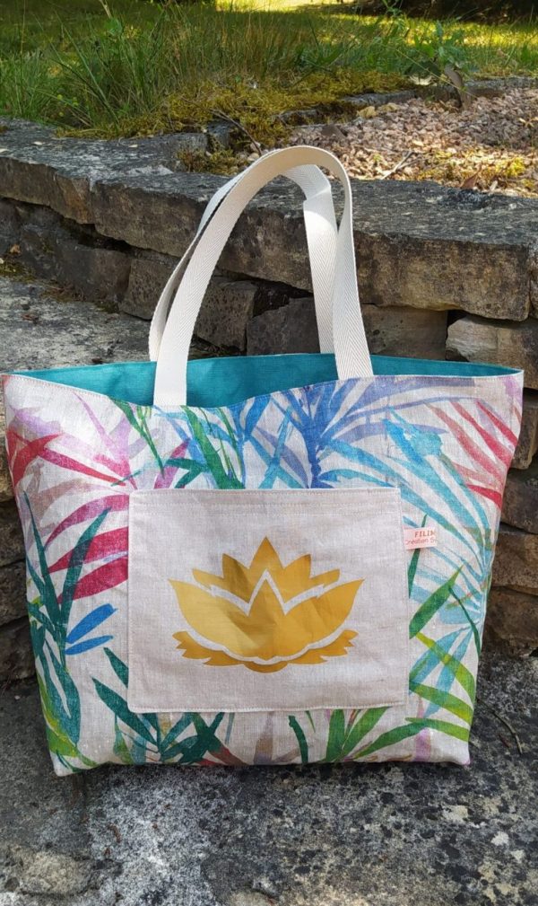 Sac cabas lin fleur de lotus  confectionné dans un sublime lin imprimé feuillage « haut de gamme ». Une poche extérieure est sublimée par une fleur de lotus dorée. Il est doublé de lin enduit.