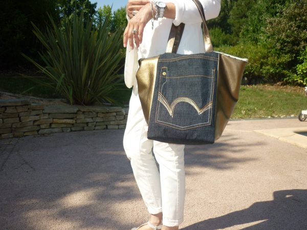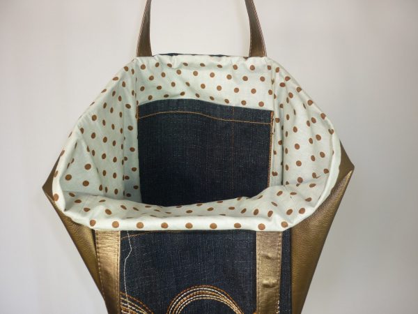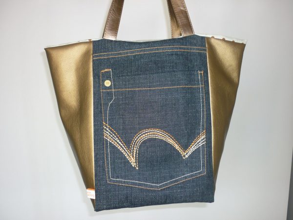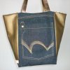 Sac cabas marron et jean recyclé, en simili marron glacé et en jean gris anthracite avec des surpiqûres marron et beige. Grande poche sur le devant du sac, poche d’origine du pantalon.