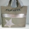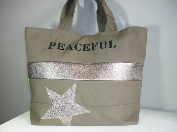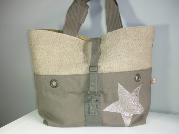 Sac cabas récup militaire étoile dorée, composé de matières issues de l’armée : sac à dos, toile de tente et bretelles. Un simili vieil or vient réveiller le tout, une broderie sur une des faces pour la tendance « grosses lettres »