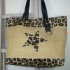 Le haut et le fond du sac sont en magnifique simili cuir imprimé léopard. Une grosse étoile dans le même simili est appliquée sur la toile de jute sur une des faces du sac.