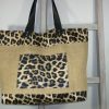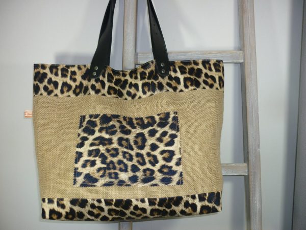 Sac cabas toile jute léopard, taillé dans une belle toile de jute naturelle. Le fond et le haut du sac sont en simili cuir imprimé léopard de qualité supérieure.