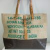 Sac cabas hyper tendance taillé dans un ancien sac de transport de café. Sur une face, chiffres et lettres d’origine, sur l’autre face une poche en coton Wax vous permet de ranger facilement votre portable. Ce sac est une pièce unique.  Le fond du sac est en simili marron foncé texturé « lézard » pour la solidité et la facilité d’entretien. Les anses sont en cuir recyclé, anciennes sangles de l’armée. Grande capacité, très léger, 522 gr, vous pourrez le prendre pour toutes les occasions.