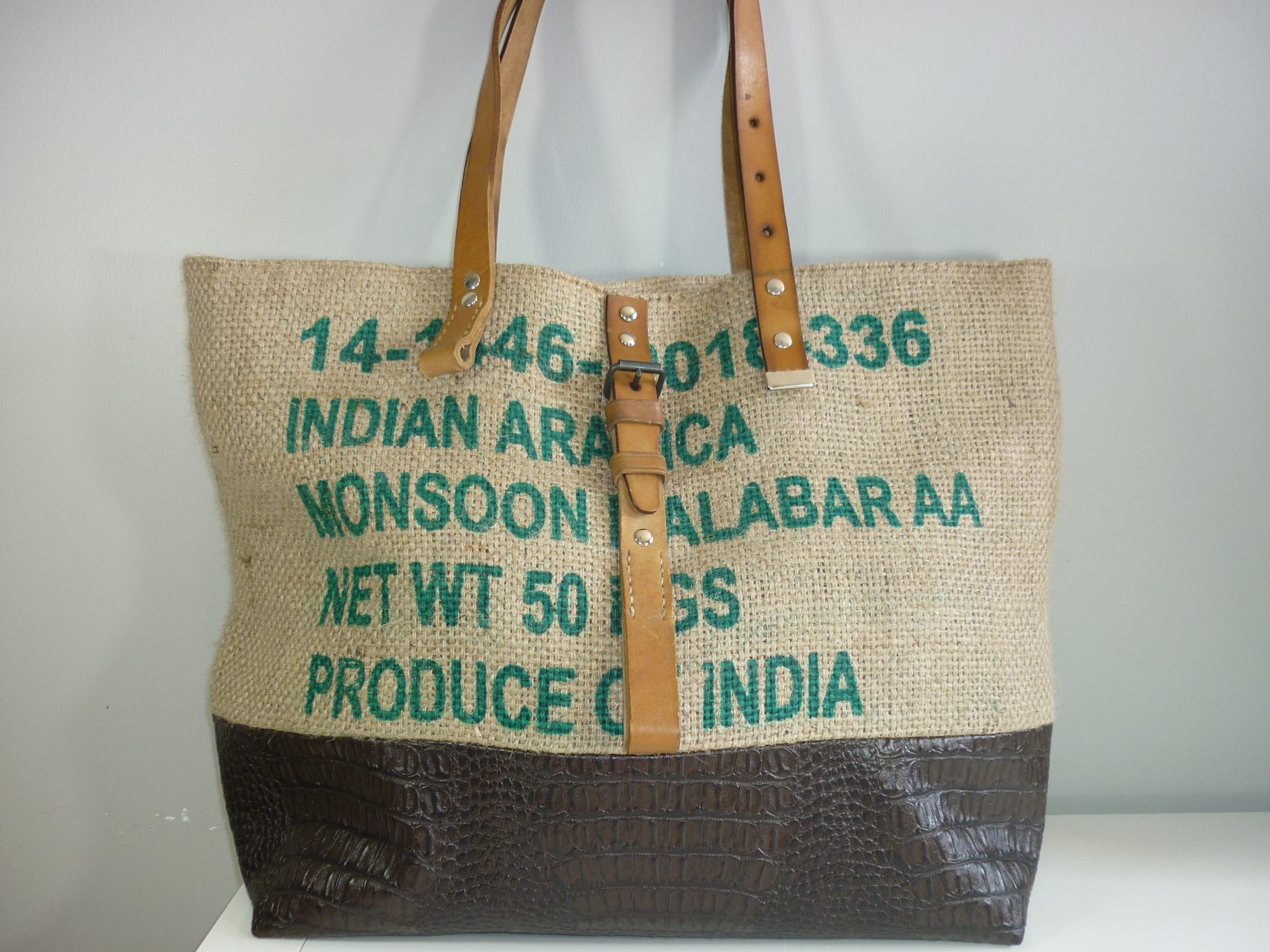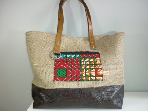 Le fond du sac est en magnifique simili cuir marron foncé texturé « lézard ». Le sac est est en toile de jute avec sur une face le texte d’origine du café, et sur l’autre face du sac, une poche en coton Wax  pour mettre votre portable ou vos clés.