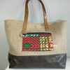 Sac cabas toile jute recyclée et wax. Le fond du sac est en simili marron foncé texturé « lézard ». Les anses sont en cuir recyclé couleur camel (ancienne ceinture et sangle de l’armée) rivetées avec des rivets en métal argenté.